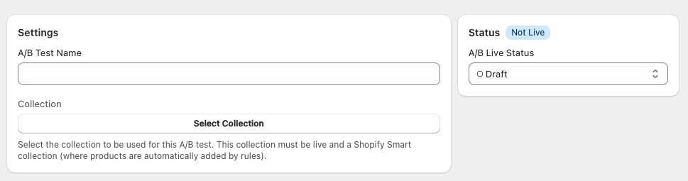 - Under 'Settings', create a new A/B test, give it a name and select the collection that'll be used in your test.