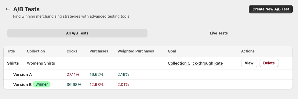 To view the results of a live test, either click View against the specific test or navigate to 'Live Tests'. Here you'll see the performance of the versions as well as if one has been crowned winner. You can also see a breakdown of what each version is testing. There'll also be a link to the collection in the Drag and Drop Merchandiser (for manually merchandised collections) or the Automation if it's added to one.