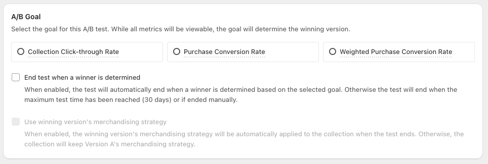 By default, Version A's merchandising strategy will be used when the test ends. If you'd like the winning strategy to be used, select 'Use winning version's merchandising strategy'.