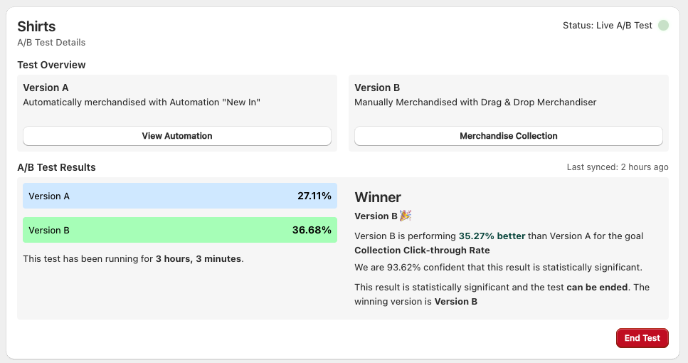 - Your A/B test will test your merchandising strategies and show you your winning version. You can end the test at anytime.